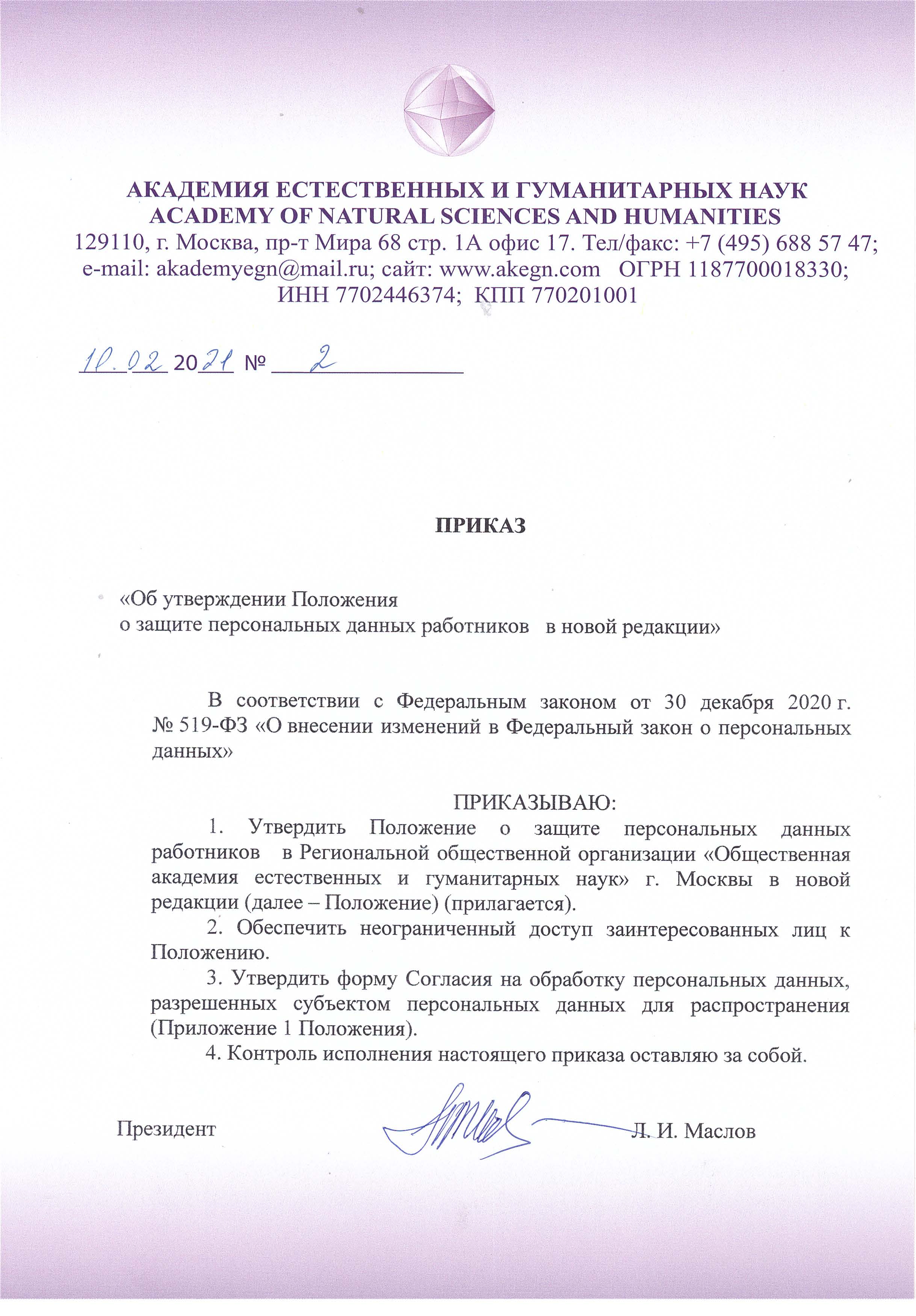 Приказ №2 2021 г. (Положение о защите ПД)